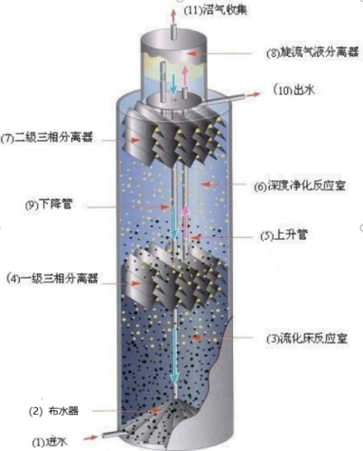 EGSB厌氧反应器是第三代厌氧反应器,其构造和IC反应器相似,由布水装置、三相分离器、出水收集装置、流化床反应装置及气液分离装置组成。EGSB厌氧反应器具有较高的高径比,一般为圆柱塔形,其高度可达20米左右。EGSB上升流速为3-7m/h,较高的上升流速可以使得泥水充分混合。颗粒污泥的膨胀床不仅改善了废水中有机物与微生物之间的接触,还大大提高了反应器的生化反应速度,从而提高了反应器的处理能力和抗冲击负荷能力。
